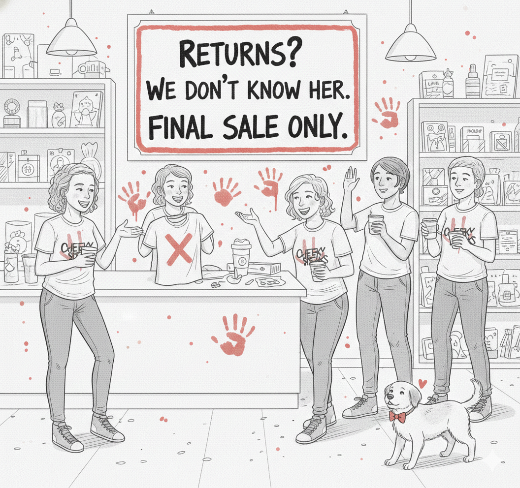 We're cheeky, not heartless. > All sales are final, but your satisfaction isn't. We want you coming back for more, so if your order isn't perfect, use the contact form to let us know.
